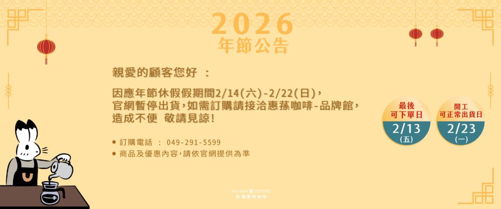 最新消息 News 𝟮𝟬𝟮𝟲 春節優惠開跑 ﹨最高享𝟴折∕ #春節優惠開跑►即日起-𝟯/𝟮 指定組合𝟖折起 ━ 𝐇𝐔𝐈𝐒𝐔𝐍 𝐂𝐎𝐅𝐅𝐄𝐄 用心款待重要的人━ ﹨在這特 […] 重要公告 | 營業時間異動 從𝟭𝟬月起,審計店營業時間將調整 謝謝大家一直以來的支持!我們會繼續與大家分享美好的咖啡時光 如有造成不便,還 […] (已結束)#2025中秋優惠開跑 指定商品85折! 月圓高掛,是家人齊聚時的笑聲與氛圍, 惠蓀咖啡陪你,把「月滿情濃」化作最好的關愛,將祝福傳遞給重要的人 中秋專 […] (已結束)𝟮𝟬𝟮𝟰►𝟏𝟐/𝟐𝟓-𝟐/𝟏𝟎春蛇送瑞x年節優惠 開跑囉✨✨ #限定優惠𝟖折起 ━ 𝐇𝐔𝐈𝐒𝐔𝐍 𝐂𝐎𝐅𝐅𝐄𝐄 用心款待重要的人━ #在這特別節日,收藏每一份濃濃情意,讓 […] 【𝐝𝐨𝐮𝐛𝐥𝐞𝟏𝟏 · 幸福】 來惠蓀咖啡【審計店】一起集點喝起來(╯✧∇✧)╯ 活動日期:𝟏𝟏/𝟗(𝑺𝒂𝒕) – 𝟏𝟏/𝟏𝟏(𝑴 […] 咖啡專欄 Coffee News 惠蓀咖啡 品牌館-2024調漲公告 獲得SCA國際指標性證照,持續精進,讓客戶安心,是惠蓀咖啡師的堅持 2023年9月,恭喜惠蓀咖啡王朝仕咖啡師,在艱辛的考核下,榮獲具國際公信力的SCA感官大師初中階證照, 因為證 […] 惠蓀咖啡埔里品牌館─無障礙空間 最友善 △ 今年五月,咖啡師朝仕,與社區講師楊文智先生,一同舉辦一場友善的無障礙咖啡分享會。 這篇就來分享內容吧! 楊 […] 惠蓀烘豆師|直火式烘培介紹篇 「堅持」是台灣惠蓀咖啡的精神。台灣惠蓀咖啡以生產台灣咖啡著名,所有工序都親力親為,打造出產、製、銷一條龍的產業 […] 咖啡哥哥教大家怎麼沖煮虹吸式咖啡 2015年鉅獻!!!!! 咖啡哥哥教大家怎麼沖煮虹吸式咖啡, 天氣冷颼颼,趕快煮杯咖啡來喝吧
