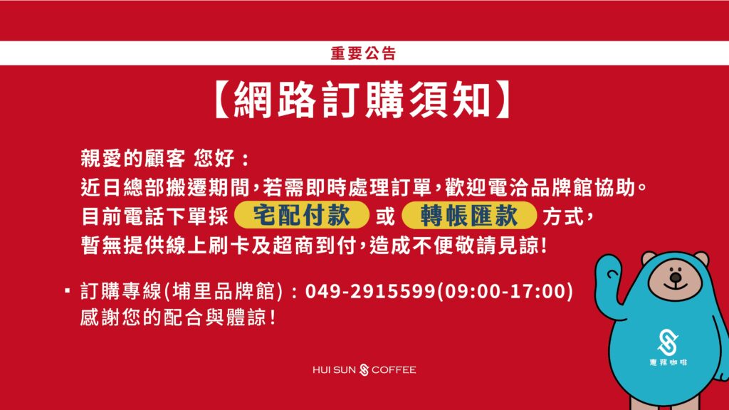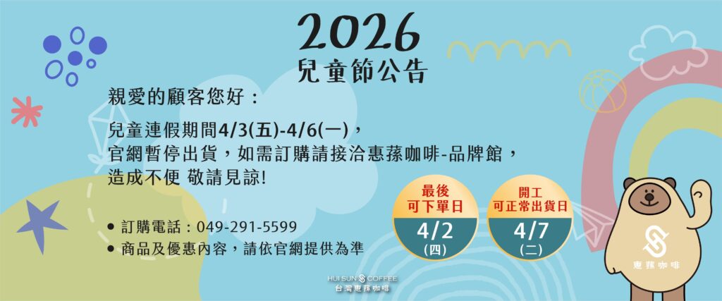 最新消息 News #審計店【結束營業公告】 感謝大家多年來的照顧,台灣惠蓀咖啡【審計店】預計於4 月底結束營業。 請留意 : 若尚有寄杯、寄豆、會員點數的 […] 【𝟐𝟎𝟐𝟔春節 公休通知】 親愛的顧客朋友,感謝支持與愛護!祝新年快樂,萬事如意 #台灣惠蓀咖啡#春節公休 【會員登入&訂購問題】 感謝您對我們的支持!因網站系統升級中,如有會員登入、需訂購商品問題,請參考電話訂購(貨到付款)服務說明,由專人 […] 𝟮𝟬𝟮𝟲 春節優惠開跑 ﹨最高享𝟴折∕ #春節優惠開跑►即日起-𝟯/𝟮 指定組合𝟖折起 ━ 𝐇𝐔𝐈𝐒𝐔𝐍 𝐂𝐎𝐅𝐅𝐄𝐄 用心款待重要的人━ ﹨在這特 […] 重要公告 | 營業時間異動 從𝟭𝟬月起,審計店營業時間將調整 謝謝大家一直以來的支持!我們會繼續與大家分享美好的咖啡時光 如有造成不便,還 […] 咖啡專欄 Coffee News 惠蓀咖啡 品牌館-2024調漲公告 獲得SCA國際指標性證照,持續精進,讓客戶安心,是惠蓀咖啡師的堅持 2023年9月,恭喜惠蓀咖啡王朝仕咖啡師,在艱辛的考核下,榮獲具國際公信力的SCA感官大師初中階證照, 因為證 […] 惠蓀咖啡埔里品牌館─無障礙空間 最友善 △ 今年五月,咖啡師朝仕,與社區講師楊文智先生,一同舉辦一場友善的無障礙咖啡分享會。 這篇就來分享內容吧! 楊 […] 惠蓀烘豆師|直火式烘培介紹篇 「堅持」是台灣惠蓀咖啡的精神。台灣惠蓀咖啡以生產台灣咖啡著名,所有工序都親力親為,打造出產、製、銷一條龍的產業 […] 咖啡哥哥教大家怎麼沖煮虹吸式咖啡 2015年鉅獻!!!!! 咖啡哥哥教大家怎麼沖煮虹吸式咖啡, 天氣冷颼颼,趕快煮杯咖啡來喝吧