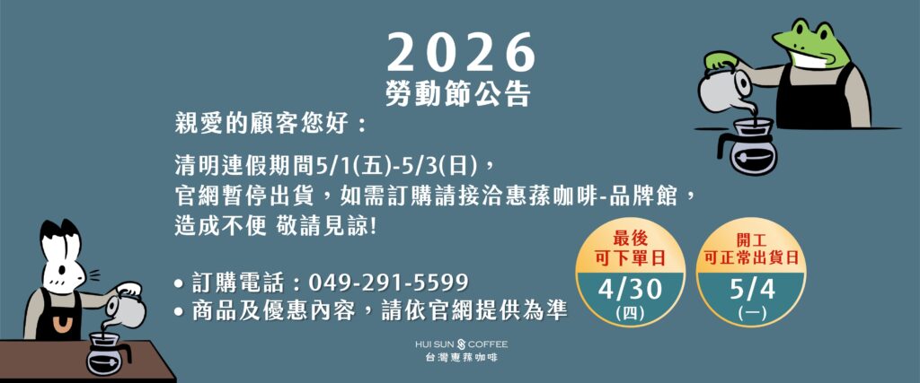 最新消息 News 審計店 | 結束營業公告 | 寄杯寄豆公告 #審計店【結束營業公告】 感謝大家多年來的照顧,台灣惠蓀咖啡【審計店】預計於4 月底結束營業。 請留意 : 若尚有寄杯、寄豆、會員點數的 […] 【𝟐𝟎𝟐𝟔春節 公休通知】 親愛的顧客朋友,感謝支持與愛護!祝新年快樂,萬事如意 #台灣惠蓀咖啡#春節公休 【會員登入&訂購問題】 感謝您對我們的支持!因網站系統升級中,如有會員登入、需訂購商品問題,請參考電話訂購(貨到付款)服務說明,由專人 […] 𝟮𝟬𝟮𝟲 春節優惠開跑 ﹨最高享𝟴折∕ #春節優惠開跑►即日起-𝟯/𝟮 指定組合𝟖折起 ━ 𝐇𝐔𝐈𝐒𝐔𝐍 𝐂𝐎𝐅𝐅𝐄𝐄 用心款待重要的人━ ﹨在這特 […] 咖啡專欄 Coffee News 惠蓀咖啡 品牌館-2024調漲公告 獲得SCA國際指標性證照,持續精進,讓客戶安心,是惠蓀咖啡師的堅持 2023年9月,恭喜惠蓀咖啡王朝仕咖啡師,在艱辛的考核下,榮獲具國際公信力的SCA感官大師初中階證照, 因為證 […] 惠蓀咖啡埔里品牌館─無障礙空間 最友善 △ 今年五月,咖啡師朝仕,與社區講師楊文智先生,一同舉辦一場友善的無障礙咖啡分享會。 這篇就來分享內容吧! 楊 […] 惠蓀烘豆師|直火式烘培介紹篇 「堅持」是台灣惠蓀咖啡的精神。台灣惠蓀咖啡以生產台灣咖啡著名,所有工序都親力親為,打造出產、製、銷一條龍的產業 […] 咖啡哥哥教大家怎麼沖煮虹吸式咖啡 2015年鉅獻!!!!! 咖啡哥哥教大家怎麼沖煮虹吸式咖啡, 天氣冷颼颼,趕快煮杯咖啡來喝吧