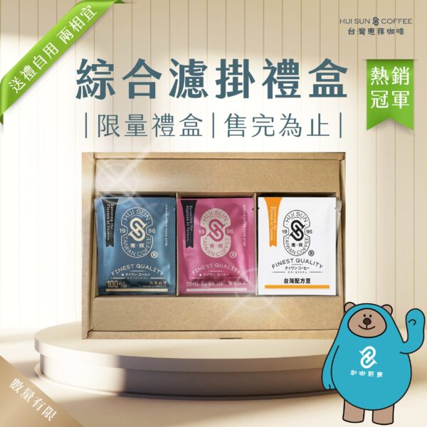 內容物 : 台灣配方豆濾掛 . 100%台灣純豆濾掛 . 紅玉紅茶咖啡濾掛 –>各8包